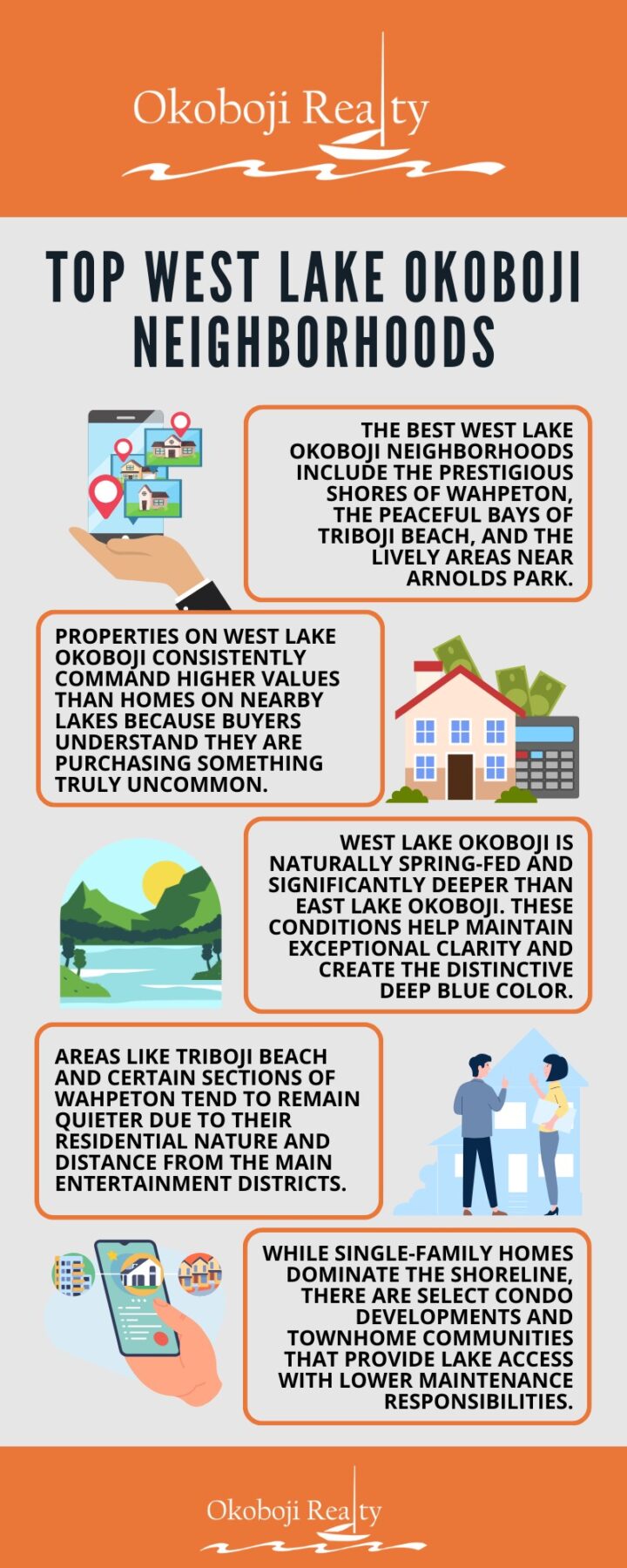 Each of these Okoboji lakefront communities offers a unique lifestyle, but all benefit from the exceptionally clear water and strong property values that define West Lake Okoboji.